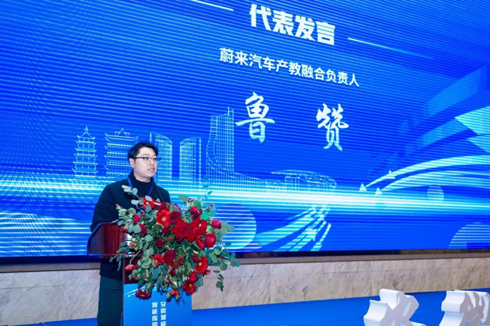 蔚来汽车产教融合负责人鲁赞代表企业发言,探讨产教融合的实践路径,与安徽智能应用职教集团联手,打破“企业与单一院校的点对点合作”,构建“产业需求牵引、院校育人支撑、集团统筹协调”的生态体系,实现标准共通,推动资源共享,促进生态共荣。